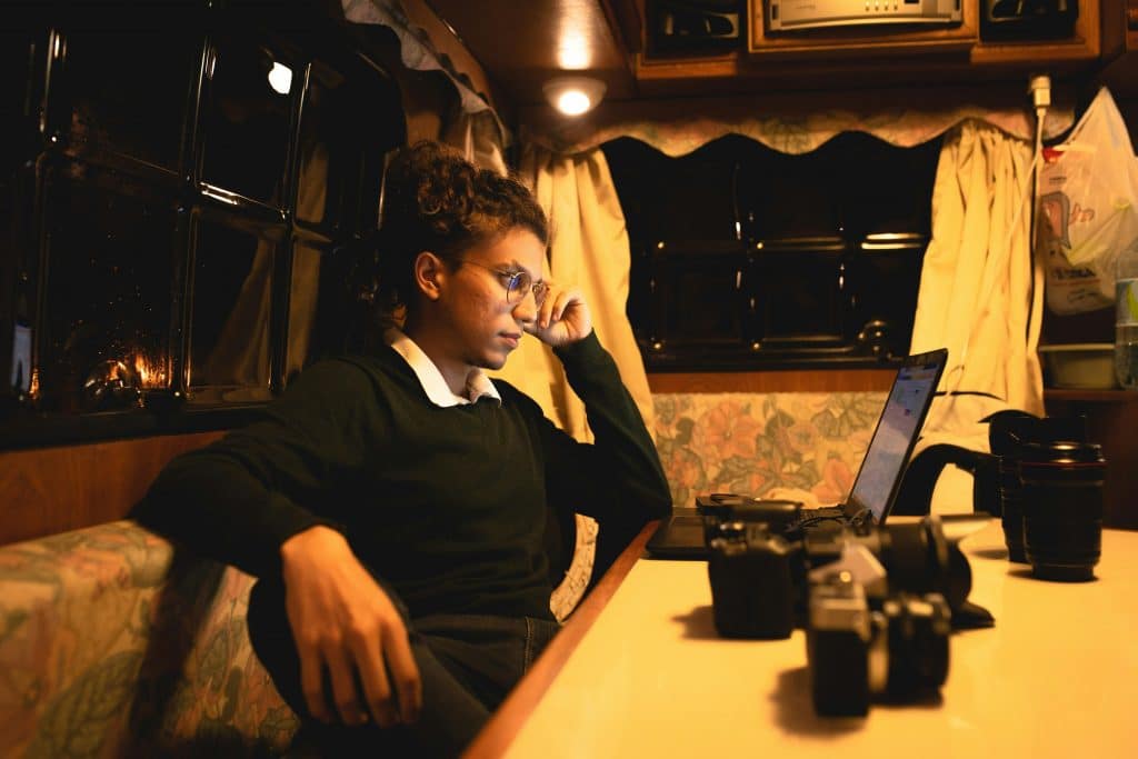 Couple using smartphone and laptop inside an RV to plan or navigate travel.